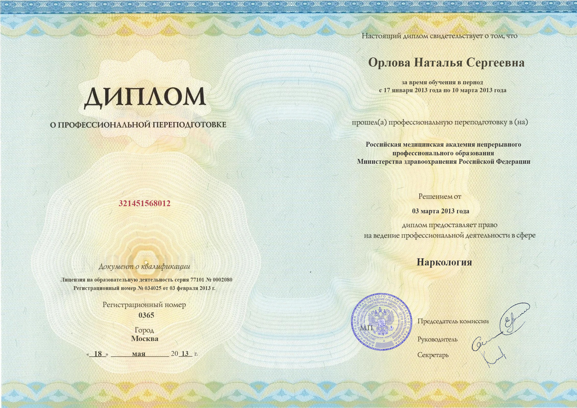 Наталья Сергеевна Орлова — опытный врач-психотерапевт, специализирующийся на лечении зависимостей. Окончила Красноярский государственный медицинский университет в 2005 году по специальности «Лечебное дело». В 2008 году окончила ординатуру по психотерапии, а в 2013 году переподготовку по наркологии.